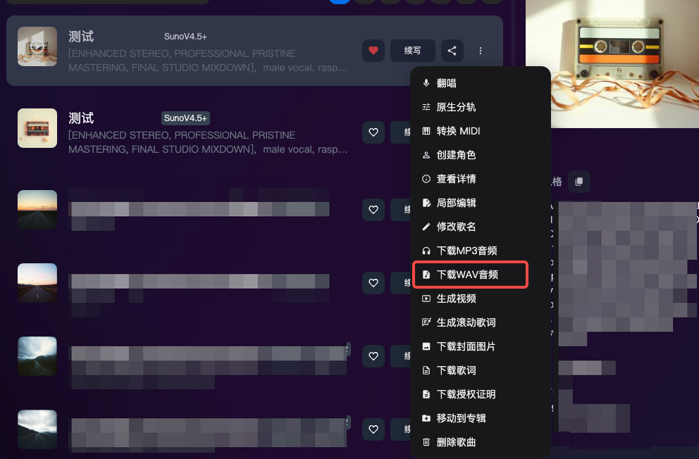 现在点击歌曲的操作按钮,即可看到 WAV 下载的功能,点击之后,等待获取 WAV 音频,成功之后即可下载。