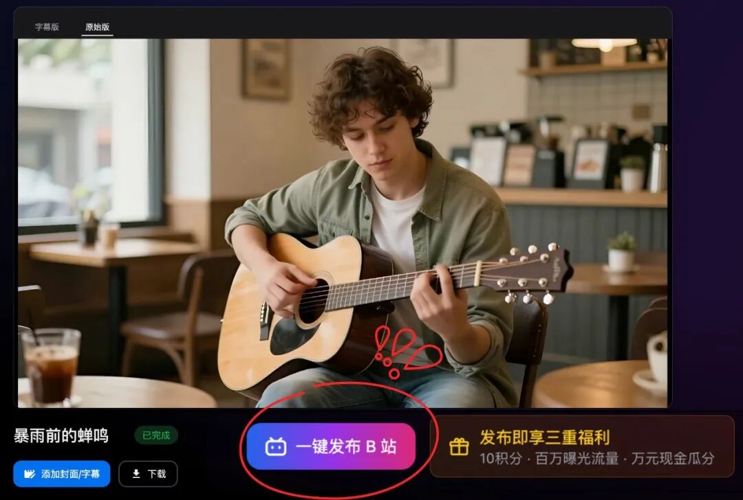 现在通过谱乐 AI创作并一键发布 AI MV 至B站,将有机会获得 百万官方流量扶持 与 十万元现金激励,优质作品还有机会进入重点推荐位。