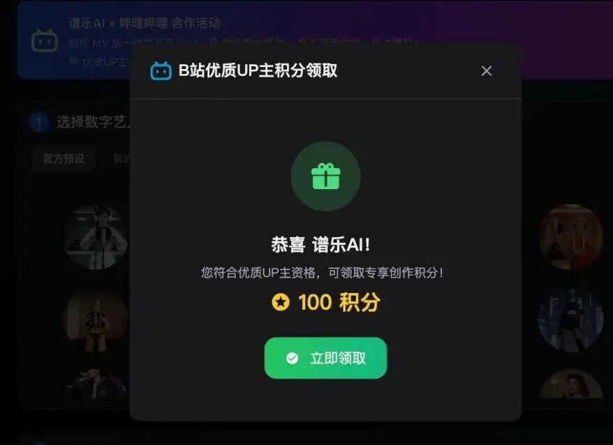 B站优质UP主可额外领取 100 创作积分,用于数字艺人与AI MV创作。