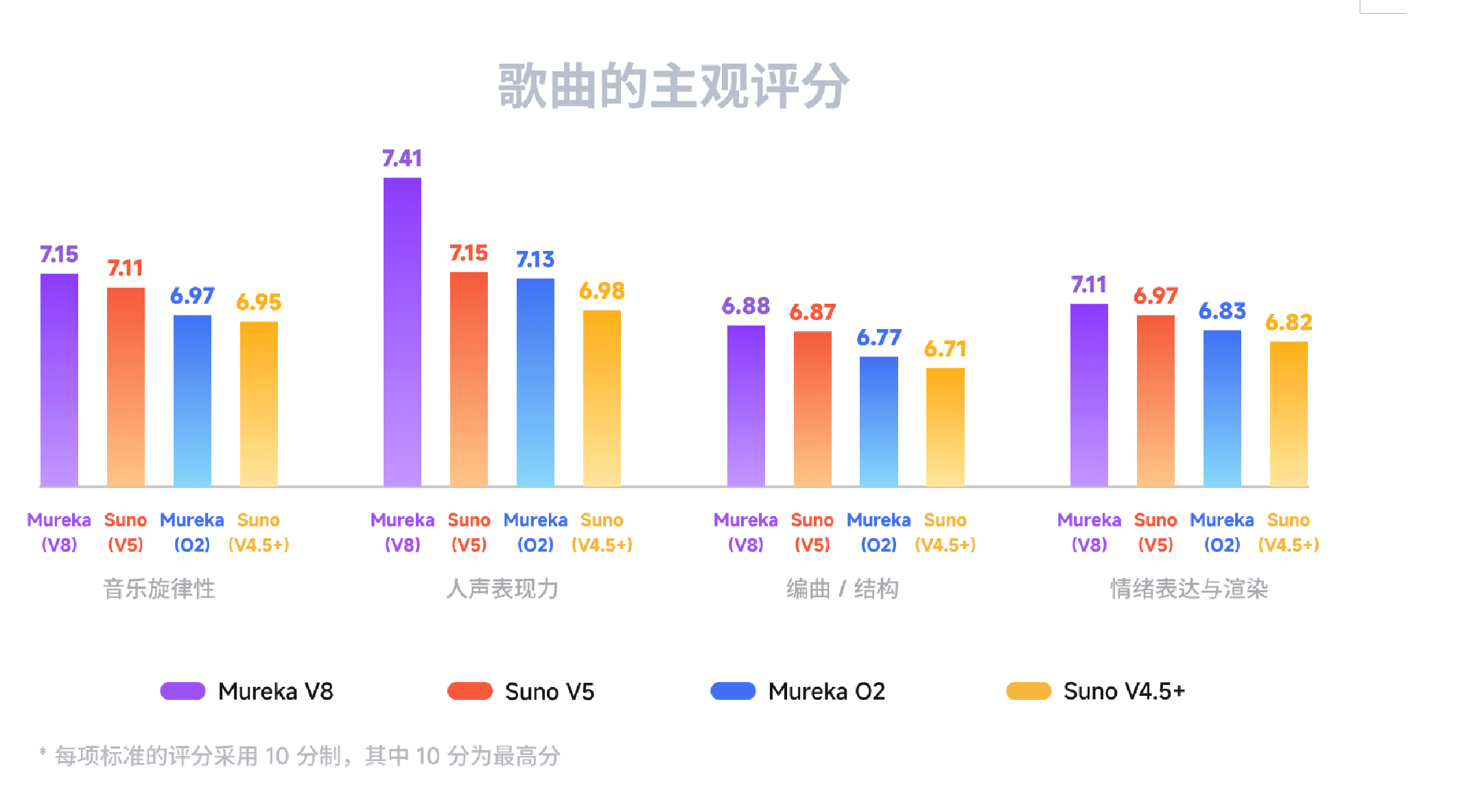 据Mureka 消息,Mureka V8 发布,首次在可发布级质量上正面超越 Suno V5,中文咬字极大优化。